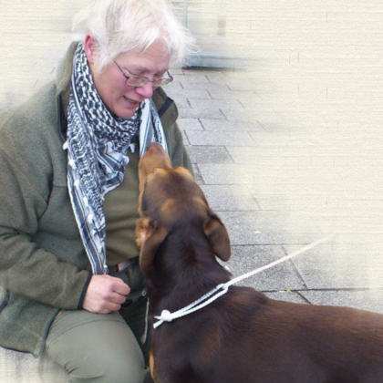 Die Halterin kniete sich zu ihm runter und sprach ihn